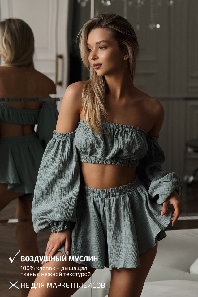 Идеальное сочетание комфорта, стиля и натуральных материалов для теплого времени года! Пижама изготовлена из 100% хлопкового муслина — легкой, дышащей и гипоаллергенной ткани, обеспечивающей максимальный комфорт во время сна и отдыха.