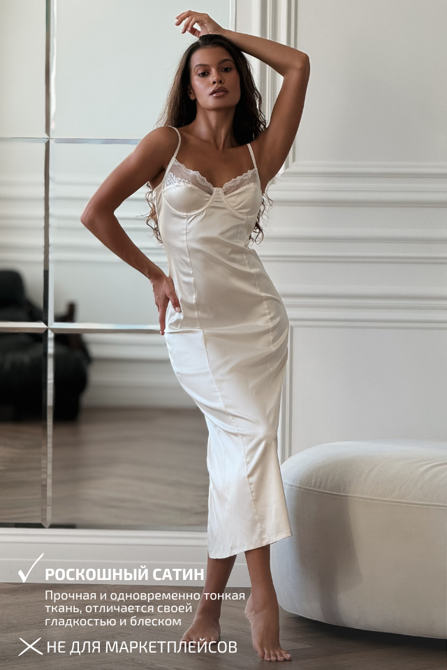 Контрастные кружевные вставки с фестончатыми краями подчёркивают женственность силуэта, добавляя образу утончённого шарма. Лёгкая, изящная и романтичная — сорочка, которая подчеркнёт красоту в каждой детали.