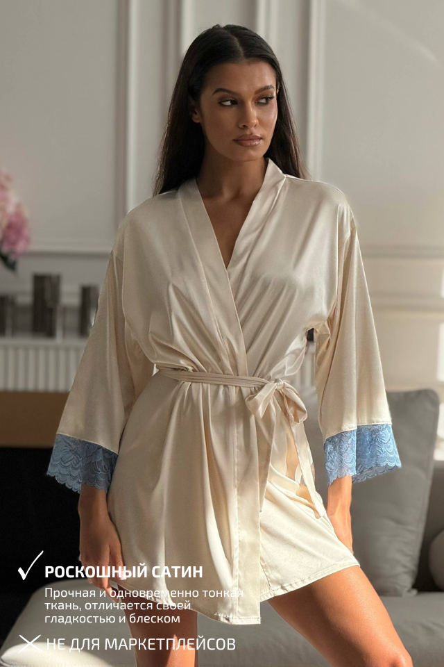 Изысканный предмет домашнего гардероба - роскошный халат, выполненный из премиального сатина, который нежно скользит по телу, слегка охлаждая кожу и снимая напряжение во время отдыха. Простой, но при этом элегантный крой халата подчеркнут акцентными вставками кружева с флористическим мотивом, которые придают модели воздушность и романтическое настроение. Широкий пояс формирует силуэт, акцентируя талию.