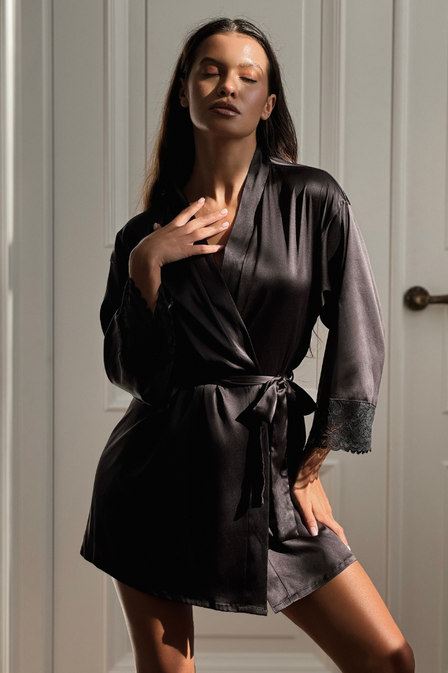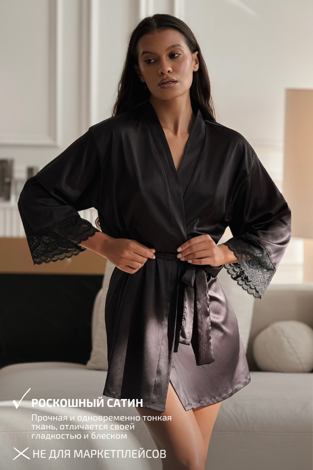 Изысканный предмет домашнего гардероба - роскошный халат, выполненный из премиального сатина, который нежно скользит по телу, слегка охлаждая кожу и снимая напряжение во время отдыха. Простой, но при этом элегантный крой халата подчеркнут акцентными вставками кружева с флористическим мотивом, которые придают модели воздушность и романтическое настроение. Широкий пояс формирует силуэт, акцентируя талию.