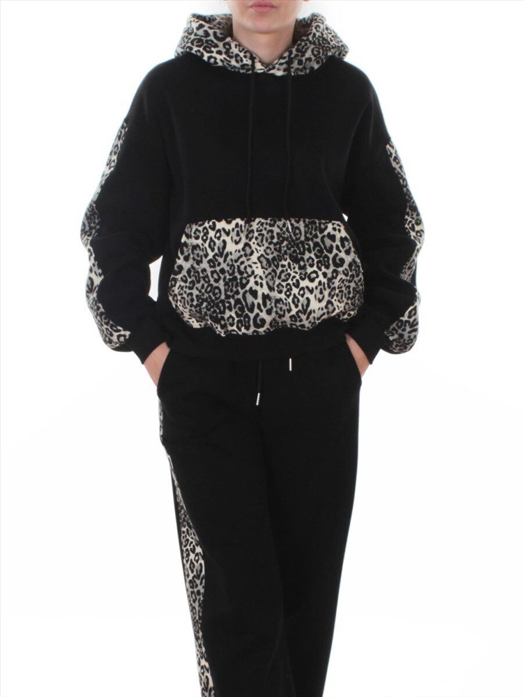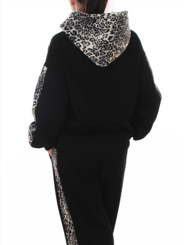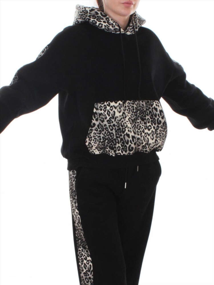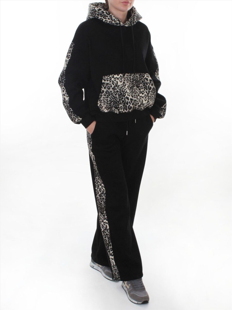 Кол-во в упаковке: 1 Костюм спортивный зимний женский (95% хлопок, 5% полиэстер) Модель сезона: осень - зима. Артикул: 008 BLACK/LEOPARD Дополнительная информация: Ткань плотная - флис. Толстовка: Несъемный двухслойный капюшон с регулировочным шнурком. На рукавах и по низу трикотажные манжеты. Карман - кенгуру. Брюки: Два кармана спереди. Пояс на резинке с регулировочным шнурком, ширина 5 см. Штаны прямого покроя. Фото сделано на модели размера 44/46 Рост модели 175 см., объем груди 90, талия 72, бедра 96. Витринный образец размера M - 44/46 российский: Толстовка: Длина спины: 59 см. Объем груди: 118 см. Объем талии: 110 см. Длина плеча до линии рукава: 21 см. Длина рукава от линии плеча 55 см. Брюки: Объем талии 70 см. (тянется) Объем бедер 114 см. Объем колена 56 см. Объем по нижней части штанины 56 см. Длина внешней части штанины (замеры из под пояса) 102 см. Длина внутренней части штанины 76 см. Посадка (с поясом) 33 см. Состав ткани: 95% хлопок, 5% полиэстер. Размер указанный на спортивном костюме и соответствие российским стандартам: M - 44/46 российский L - 46/48 российский XL - 48/50 российский Комментарии к товару