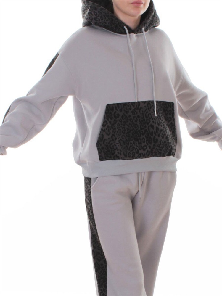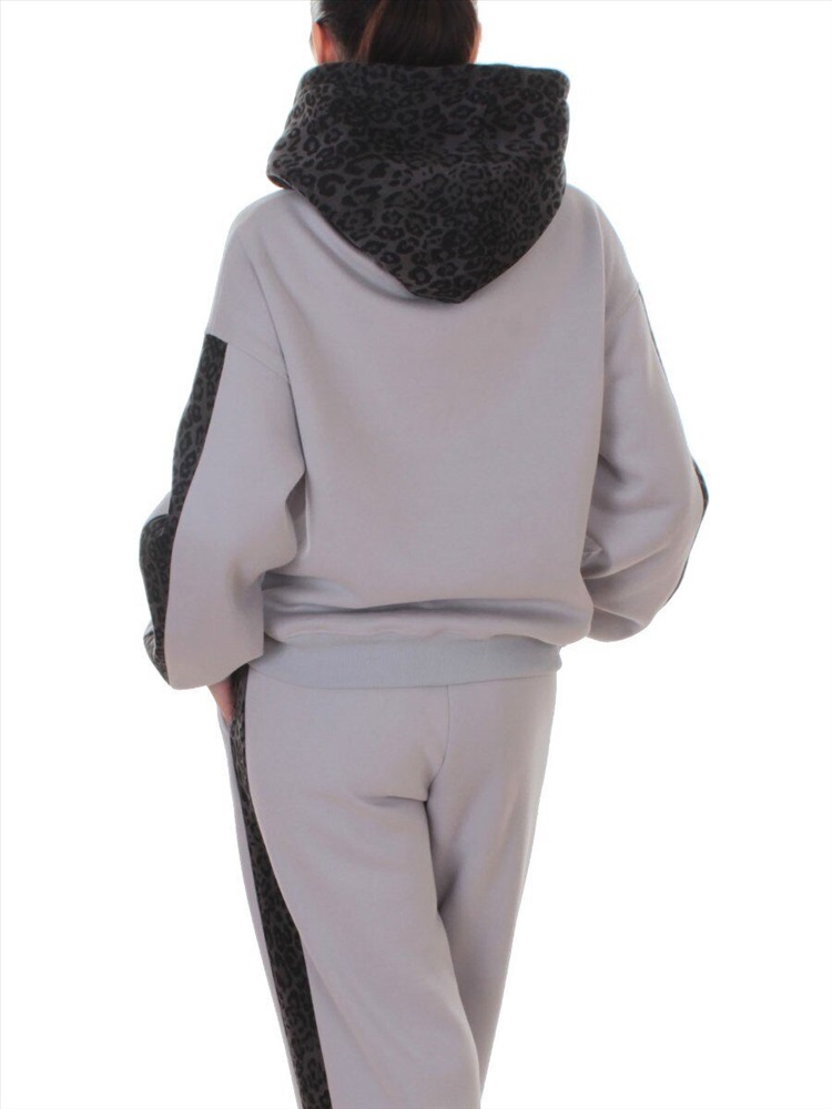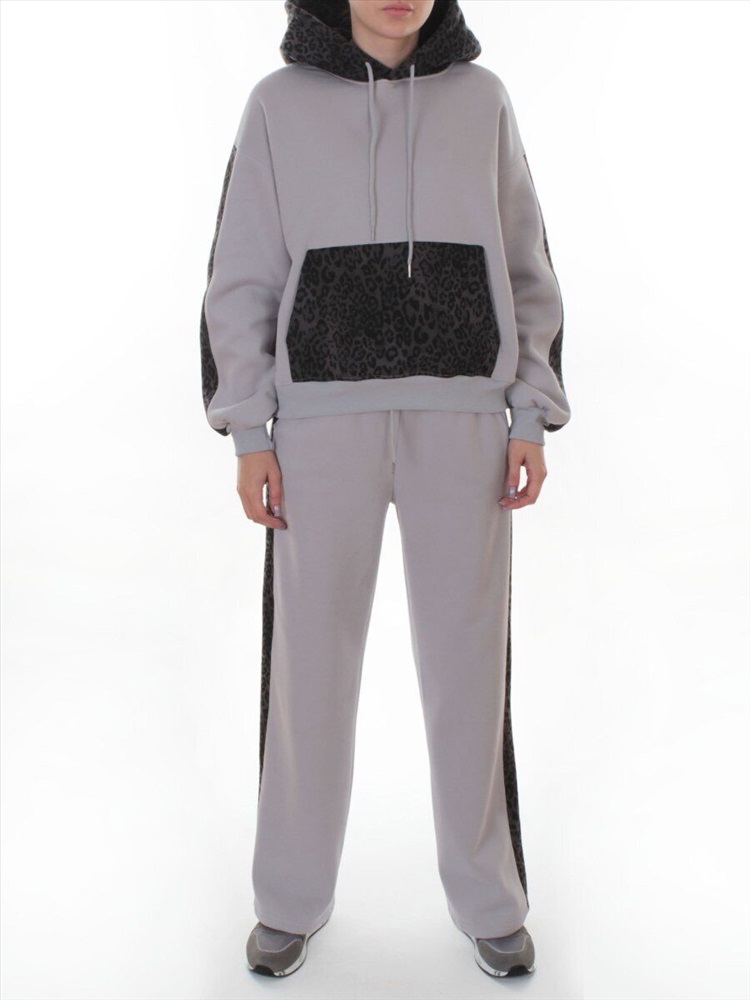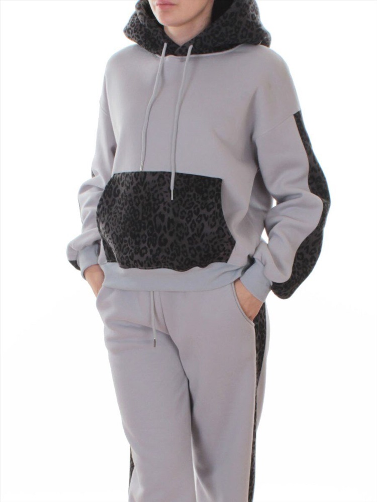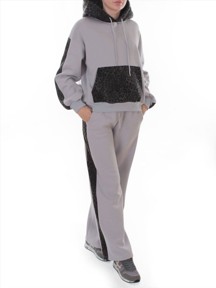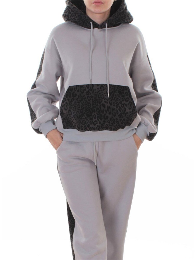 Кол-во в упаковке: 1 Костюм спортивный зимний женский (95% хлопок, 5% полиэстер) Модель сезона: осень - зима. Артикул: 008 GRAY/LT. BLUE/LEOPARD Дополнительная информация: Ткань плотная - флис. Толстовка: Несъемный двухслойный капюшон с регулировочным шнурком. На рукавах и по низу трикотажные манжеты. Карман - кенгуру. Брюки: Два кармана спереди. Пояс на резинке с регулировочным шнурком, ширина 5 см. Штаны прямого покроя. Фото сделано на модели размера 44/46 Рост модели 175 см., объем груди 90, талия 72, бедра 96. Витринный образец размера M - 44/46 российский: Толстовка: Длина спины: 59 см. Объем груди: 118 см. Объем талии: 110 см. Длина плеча до линии рукава: 21 см. Длина рукава от линии плеча 55 см. Брюки: Объем талии 70 см. (тянется) Объем бедер 114 см. Объем колена 56 см. Объем по нижней части штанины 56 см. Длина внешней части штанины (замеры из под пояса) 102 см. Длина внутренней части штанины 76 см. Посадка (с поясом) 33 см. Состав ткани: 95% хлопок, 5% полиэстер. Размер указанный на спортивном костюме и соответствие российским стандартам: M - 44/46 российский L - 46/48 российский XL - 48/50 российский Комментарии к товару