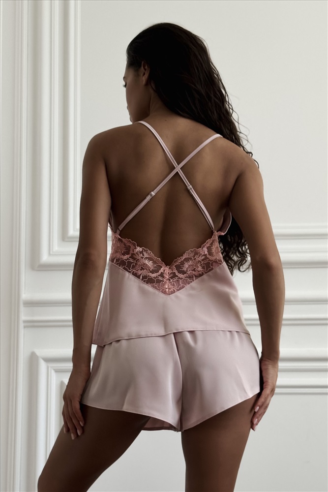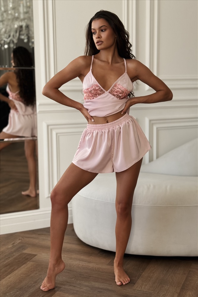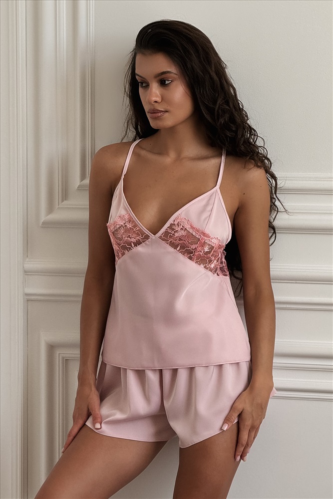 Пижама из атласной ткани с изысканной отделкой. Лёгкий топ на тонких бретелях с V-образным вырезом гармонично сочетается с шортами свободного кроя. Отрезные чашечки лифа декорированы фигурными вставками кружева с флористической вышивкой, которые игриво приоткрывают грудь.