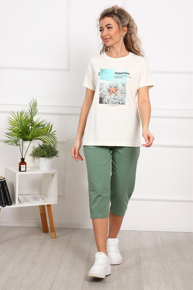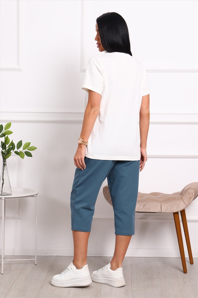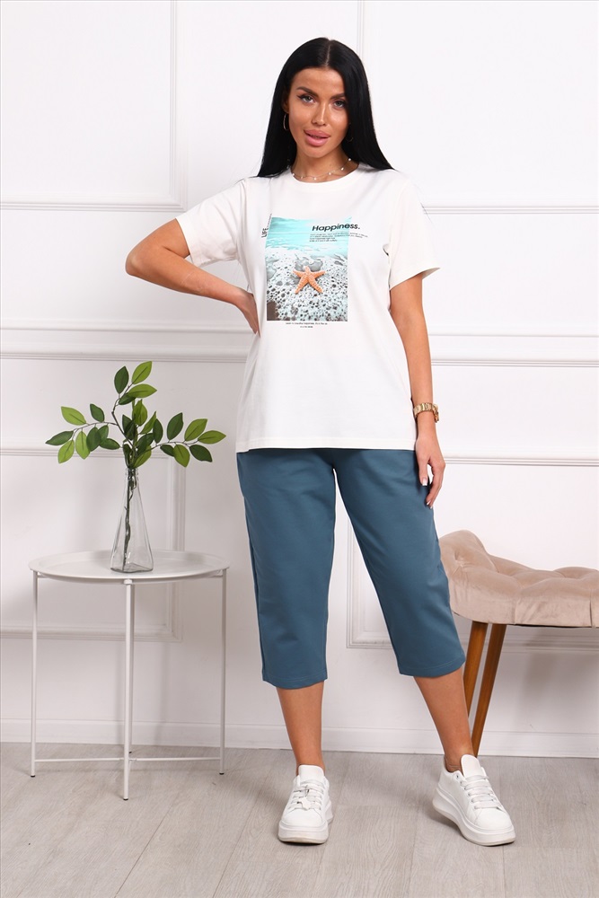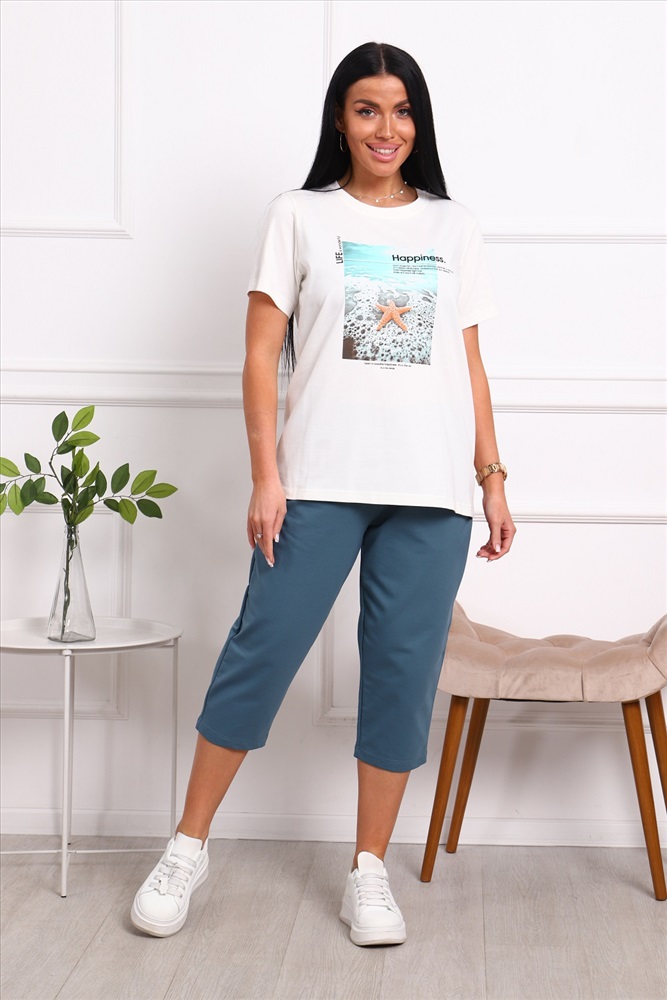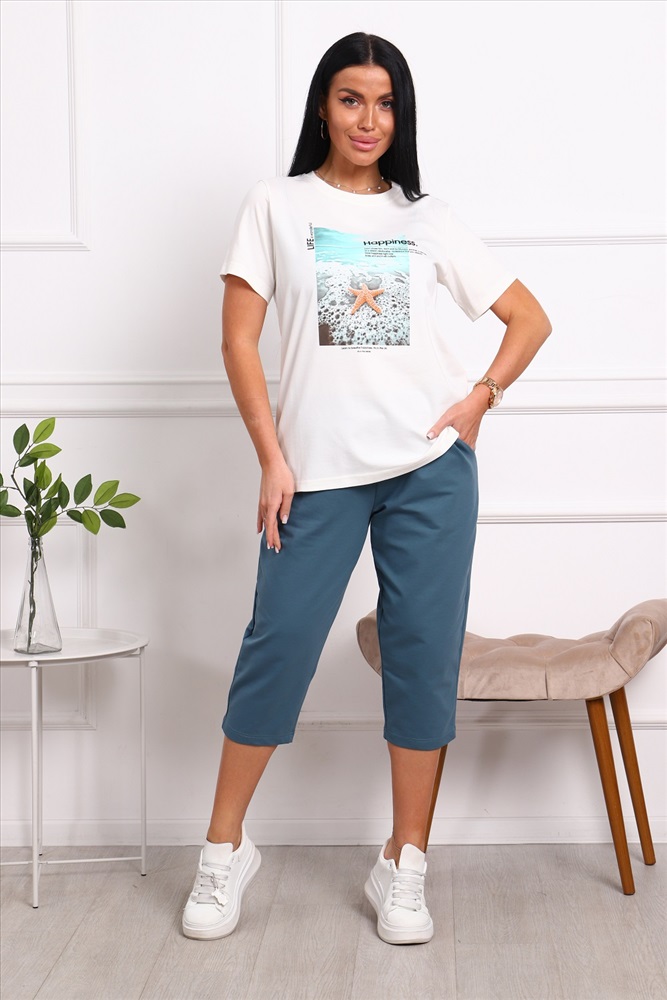 Костюм женский: футболка с принтом и бриджи.