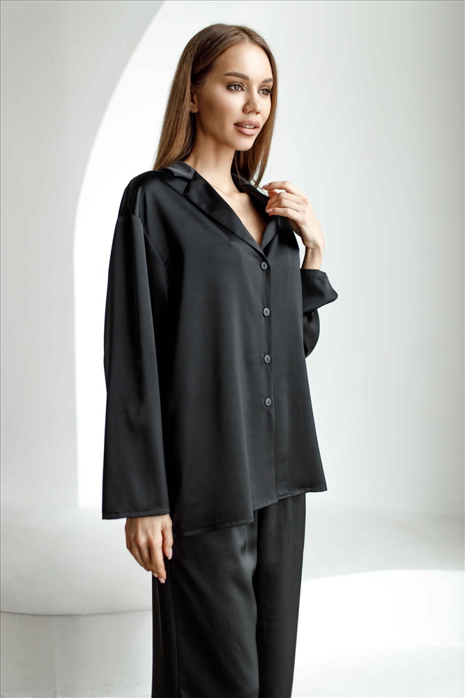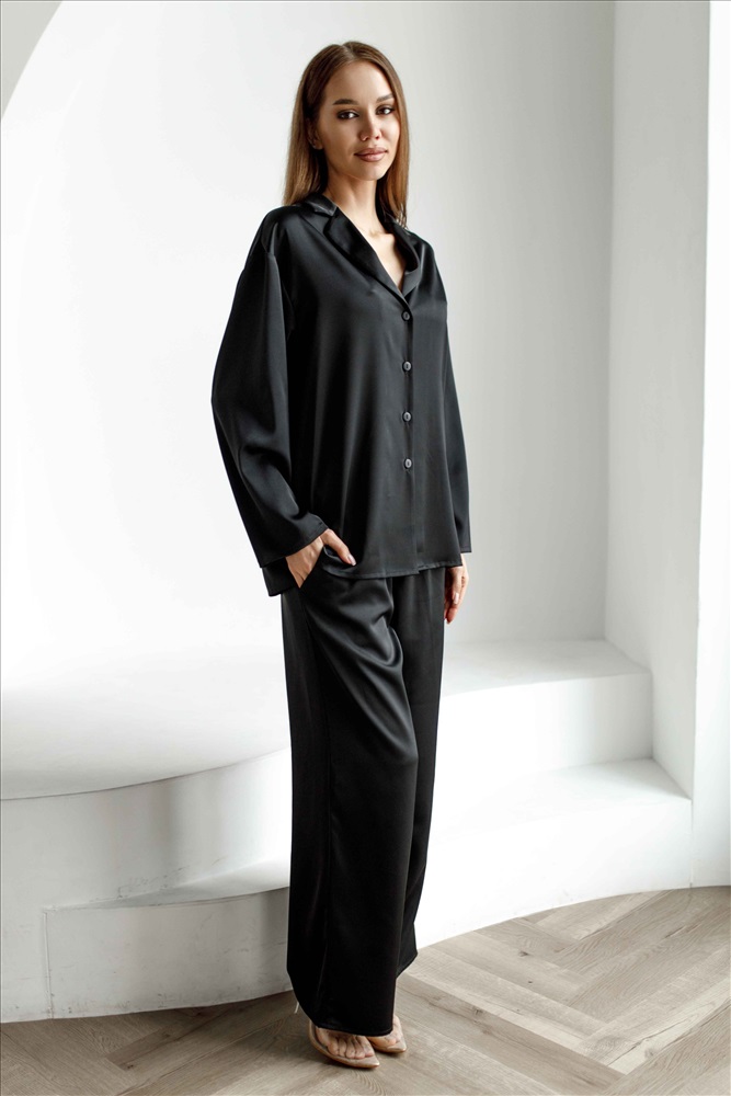 Роскошный домашний комплект выполнен из высококачественного плотного атласа. Рубашка с длинным рукавом привлекает внимание. Отложной воротник, застежка на пуговицы. Удобные, длинные брюки свободного кроя с плоской резинкой по талии плавно ниспадают вниз, не сковывая движения.