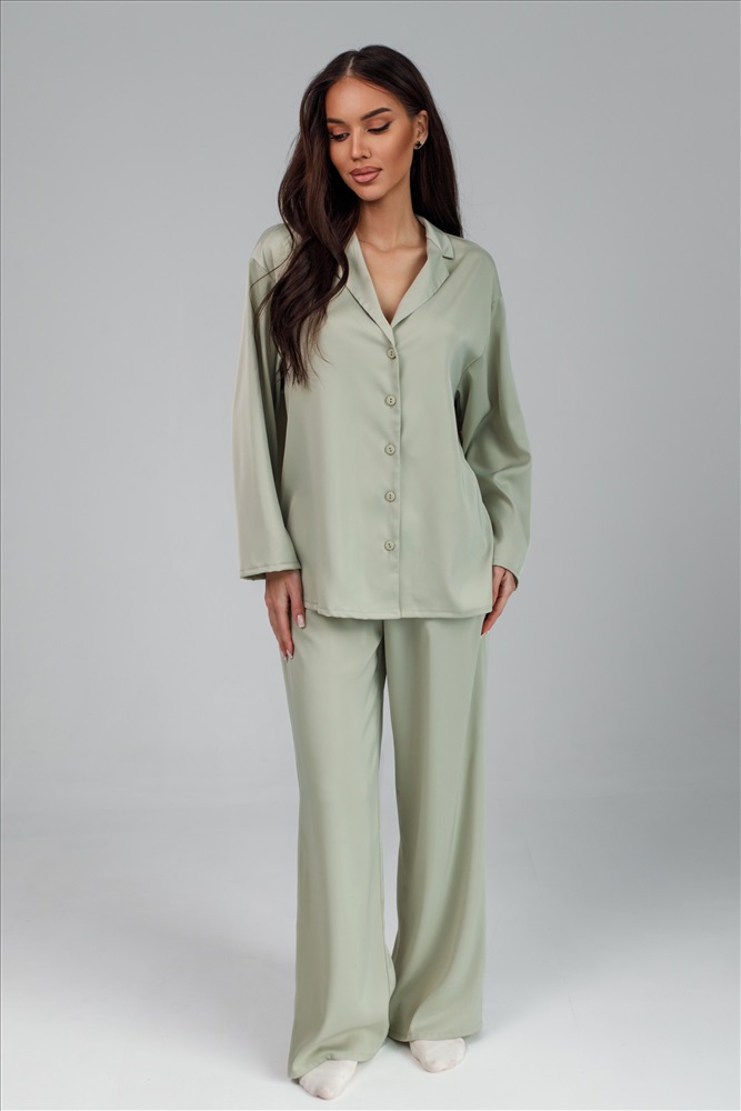Роскошный домашний комплект выполнен из высококачественного плотного атласа. Рубашка с длинным рукавом привлекает внимание. Отложной воротник, застежка на пуговицы. Удобные, длинные брюки свободного кроя с плоской резинкой по талии плавно ниспадают вниз, не сковывая движения.