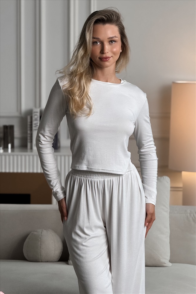 Топ с неглубоким круглым вырезом и длинным рукавом обеспечивает удобство и свободу движений. Длинные брюки на резинке обеспечивают комфортную посадку. Комплект сочетает в себе комфорт и практичность, и станет отличным дополнением к вашему гардеробу.