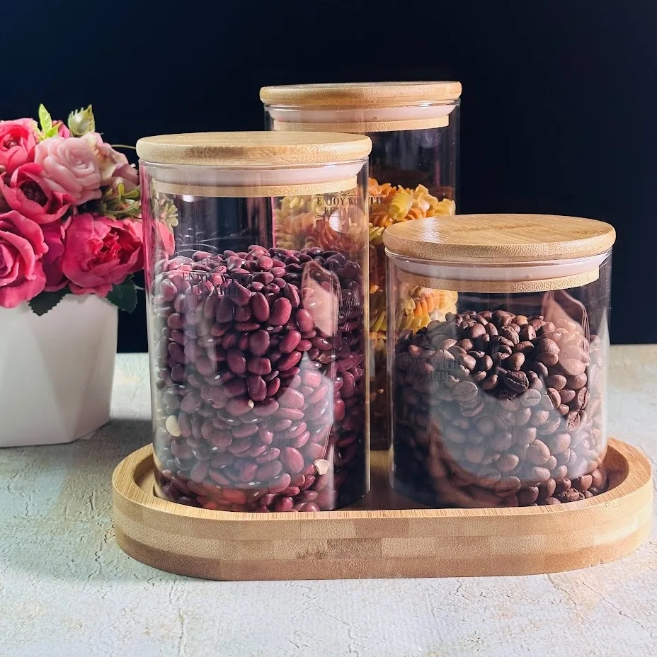 Набор банок для хранения специй, сахара, кофе изготовлена из стекла, крышка из бамбука с силиконовым уплотнителем, объемы 700/900/1050 мл. Банки размещаются на подставке из бамбука