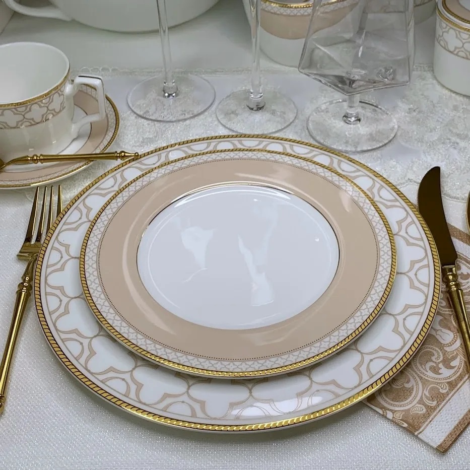Коллекция ЖОЗЕФИНА изготовлена из тончайшего костяного фарфора. Посуду отличет пудрово-бежевый декор в сочетании с золотой окантовкой. Легкий, прозрачный и очень нежный.