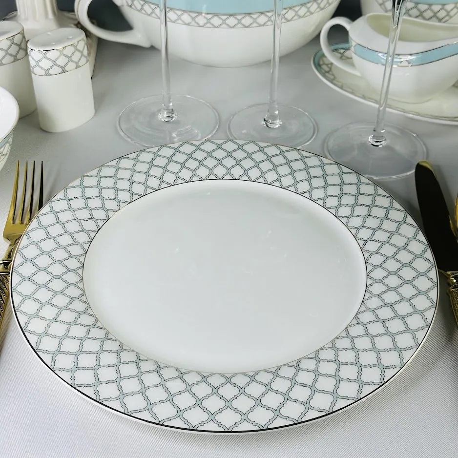 Изысканная коллекция ВЕРСАЛЬ изготовлена из полупрозрачного костяного фарфора. Изысканная палитра, сочетающая в себе нежные оттенки небесно-голубого цвета и золотого декора, очаровывает своей глубиной и игрой света. Изящные позолоченные края, словно лучи солнца, обрамляют тарелки. Утонченный рисунок из немецкого золота выполнен с искусной точностью. Коллекция состоит из предметов сервировка, обеденных, чайных и кофейных сервизов.