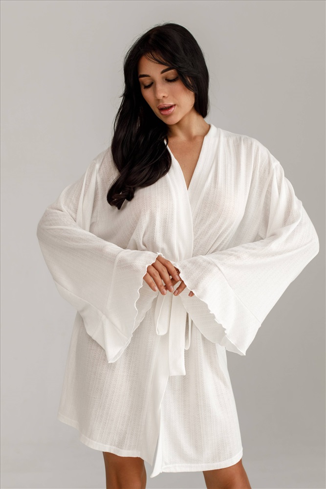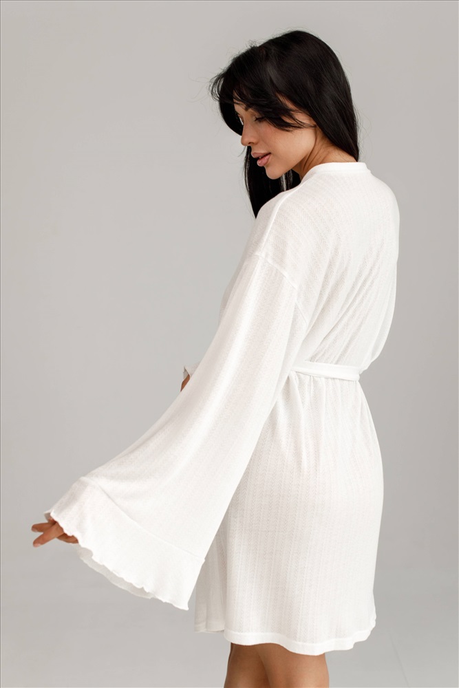 Трикотажный халат с поясом на талии — воплощение комфорта и уюта. Лёгкий, мягкий материал приятно прилегает к телу. Широкие рукава с воланами придают образу особую изысканность.