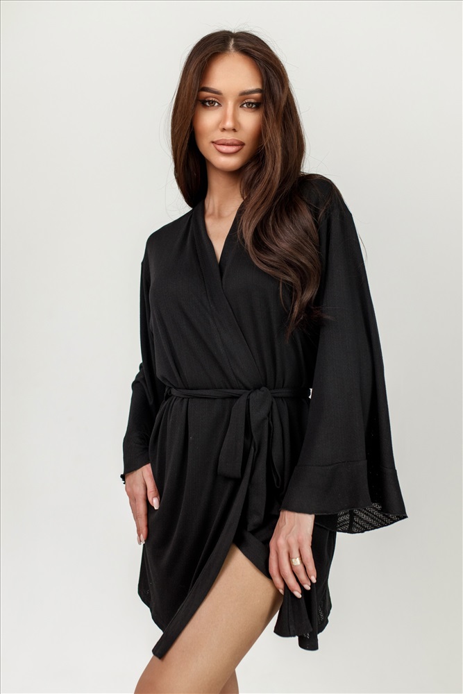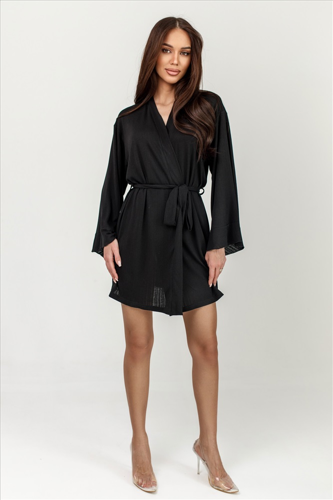Трикотажный халат с поясом на талии — воплощение комфорта и уюта. Лёгкий, мягкий материал приятно прилегает к телу. Широкие рукава с воланами придают образу особую изысканность.
