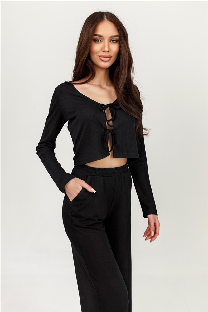 Невероятно мягкая и приятная к телу пижама с брюками и длинными рукавами идеально подойдет для прохладных вечеров, а завязки на топе позволят регулировать посадку по фигуре.