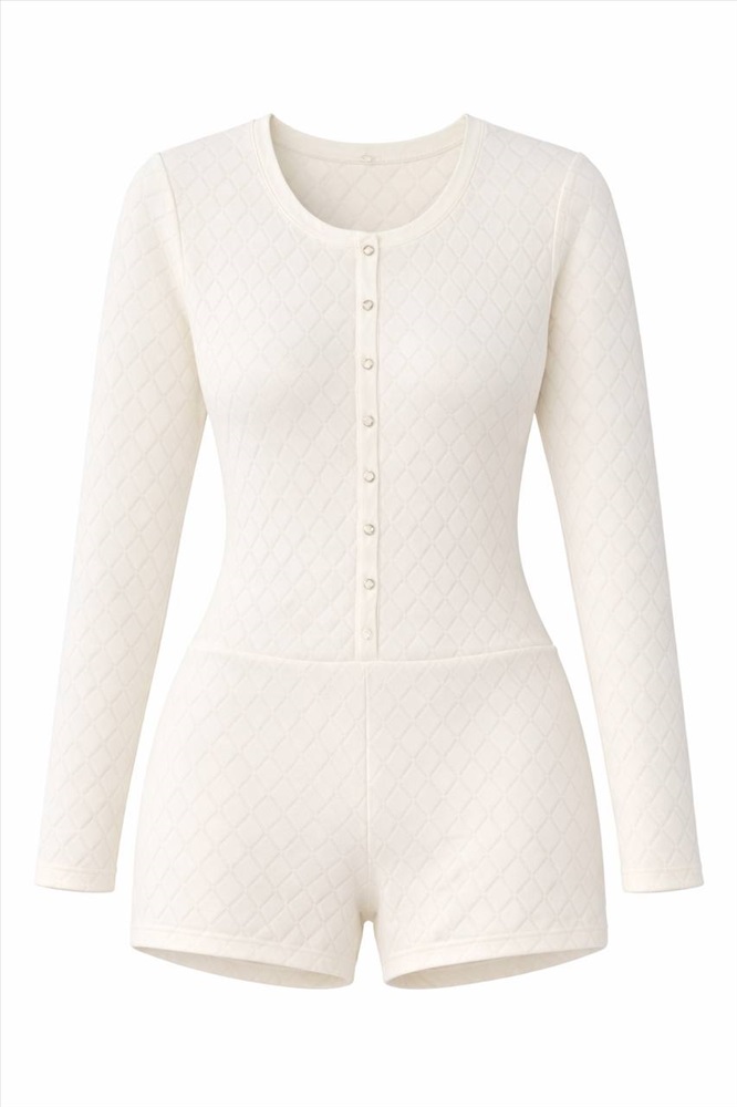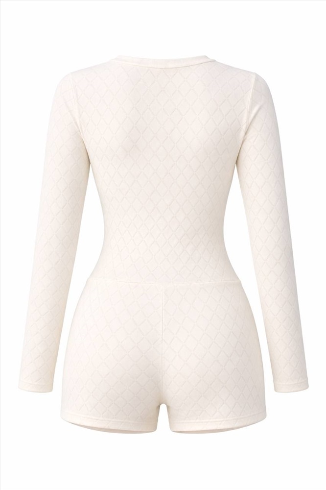 Элегантный комбинезон с лаконичным дизайном и выразительной текстурой ромбовидной стёжки. Облегающий крой подчёркивает силуэт, а застёжка на кнопках спереди добавляет утончённый акцент. Длинные рукава и шорты сбалансированной длины обеспечивают комфорт и современный вид.