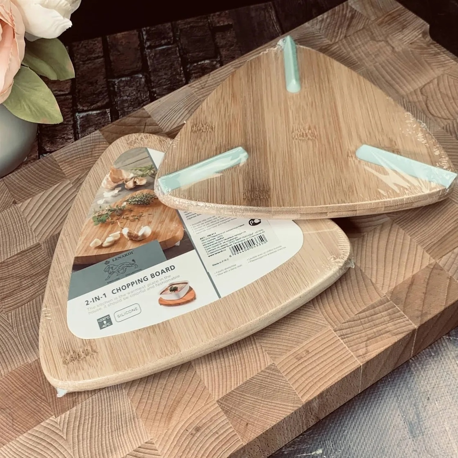 Необычная треугольная разделочная доска из бука, силиконовые ножка делают ее более устойчивой, доска не скользит