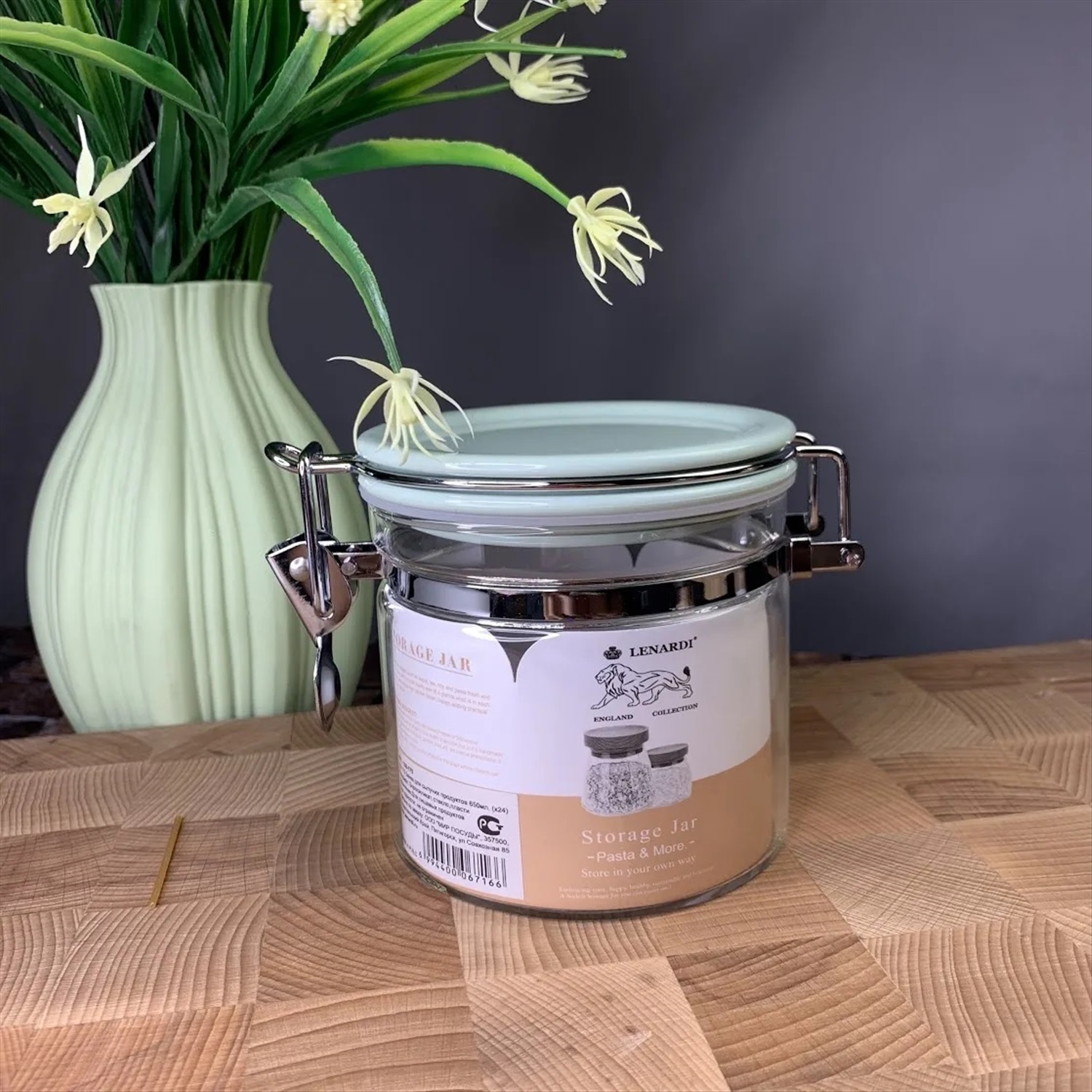 Баночка хранения специй, сахара, кофе изготовлена из стекла, крышка из цветного пластика с бугельным замком и силиконовым уплотнителем, объем 650 мл.