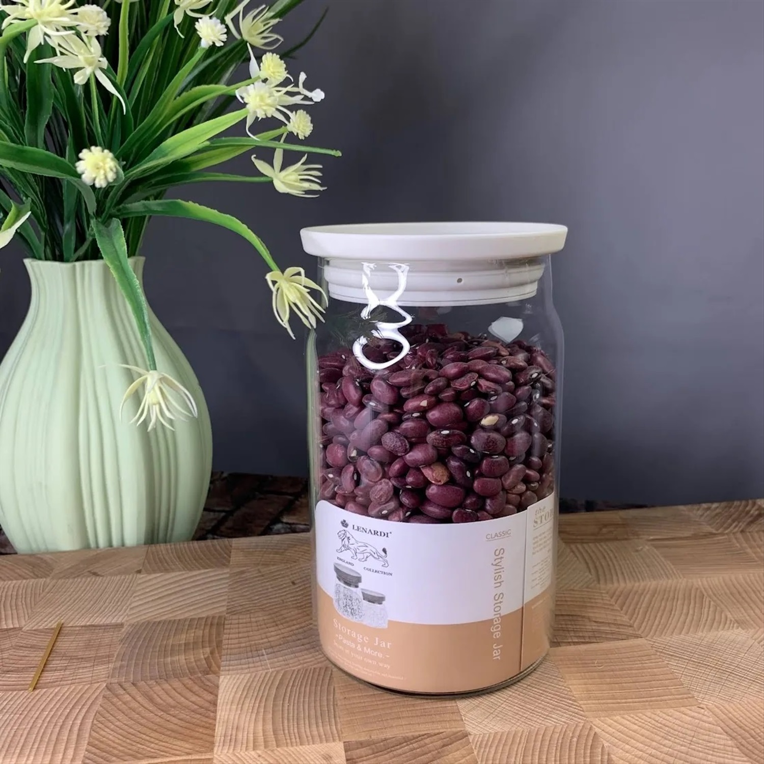 Баночка хранения специй, сахара, кофе изготовлена из стекла, крышка из цыетного пластика с силиконовым уплотнителем, объем 900 мл.