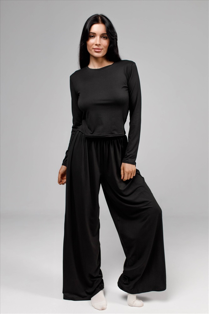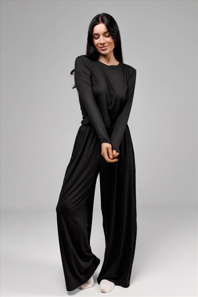 Топ с неглубоким круглым вырезом и длинным рукавом обеспечивает удобство и свободу движений. Длинные брюки на резинке обеспечивают комфортную посадку. Комплект сочетает в себе комфорт и практичность, и станет отличным дополнением к вашему гардеробу.