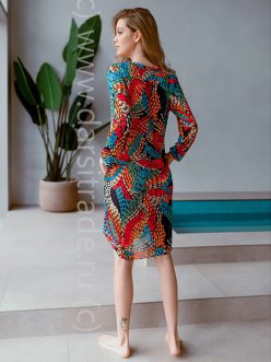 Туника пляжная женская Mia-Mia выполнена из эластичной сетки с ярким принтом. Модель прямого силуэта средней длинны. Длинный рукав на манжете с резинкой. Спинка на кокетке со складками по центру. В боковых швах туники карманы. Горловина и низ рукавов обработаны обтачкой из эластичной однотонной сетки. Фигурный вырез горловины подчеркнут кантом. Подол туники обработан швом "краевка".