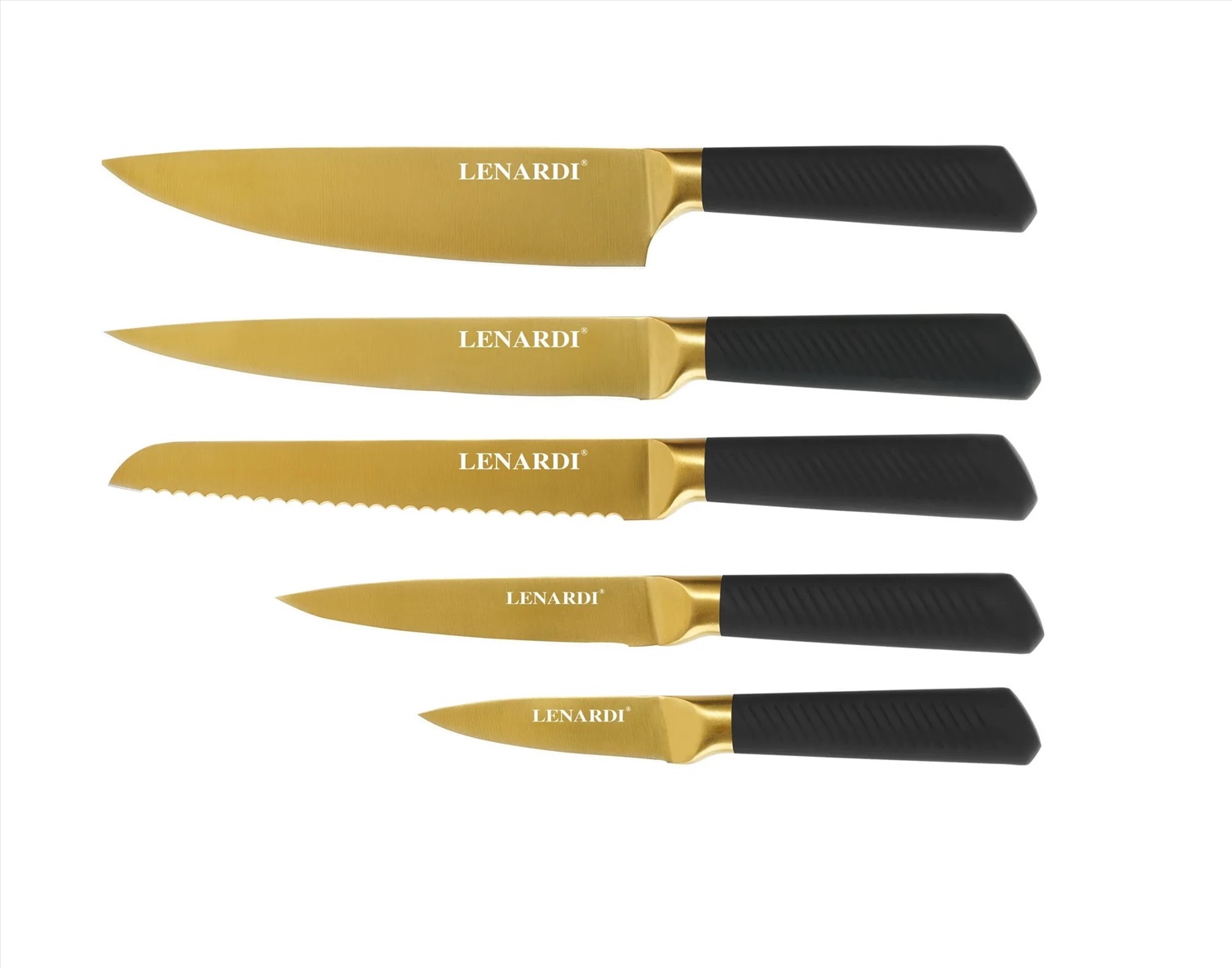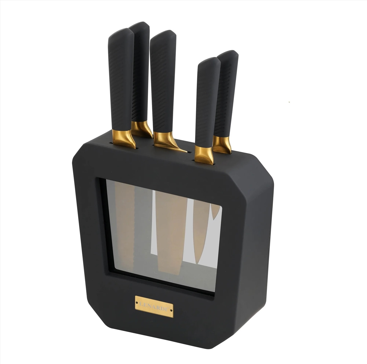 Набор ножей на подставке. Ножи изготовлены из нержавеющей стали, подставка из пластика. Наполнение: - нож поварской 20см