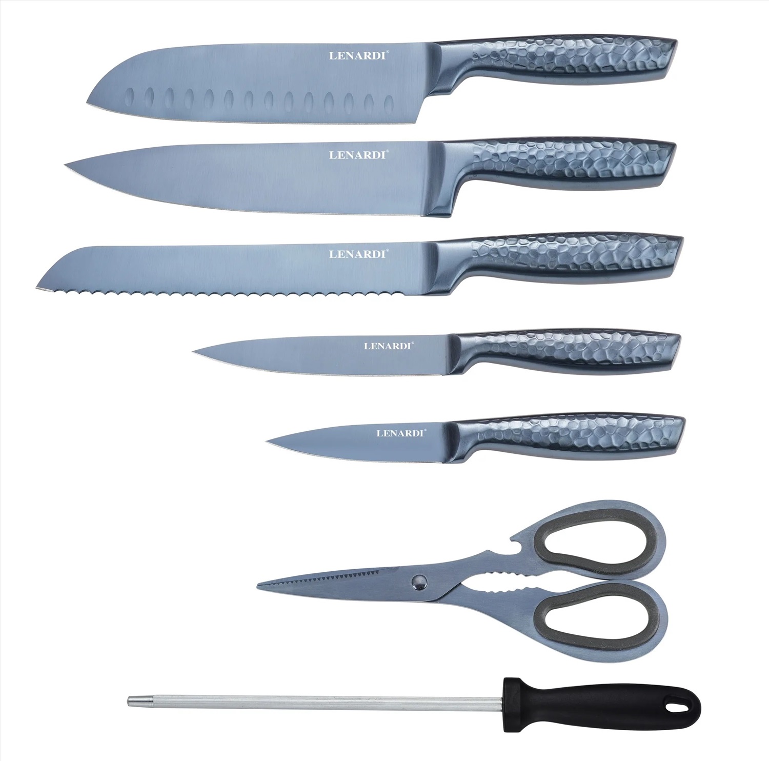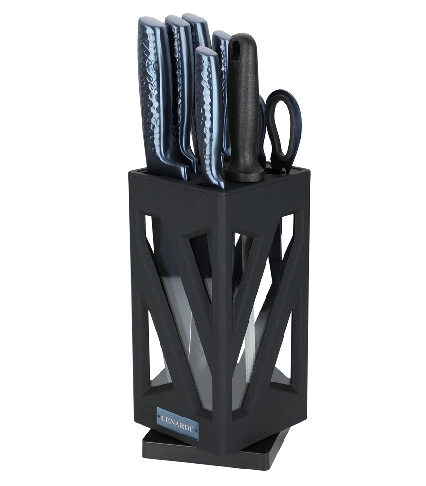 Набор ножей на подставке. Ножи изготовлены из нержавеющей стали, подставка из пластика. Наполнение: - нож поварской 20см