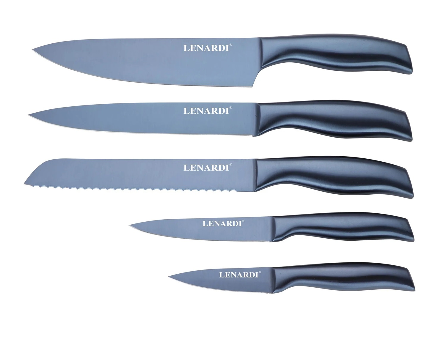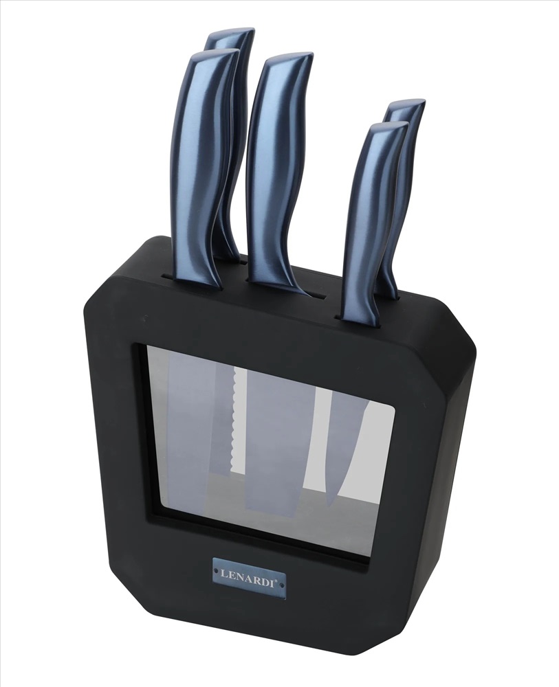 Набор ножей на подставке. Ножи изготовлены из нержавеющей стали, подставка из пластика. Наполнение: - нож поварской 20см