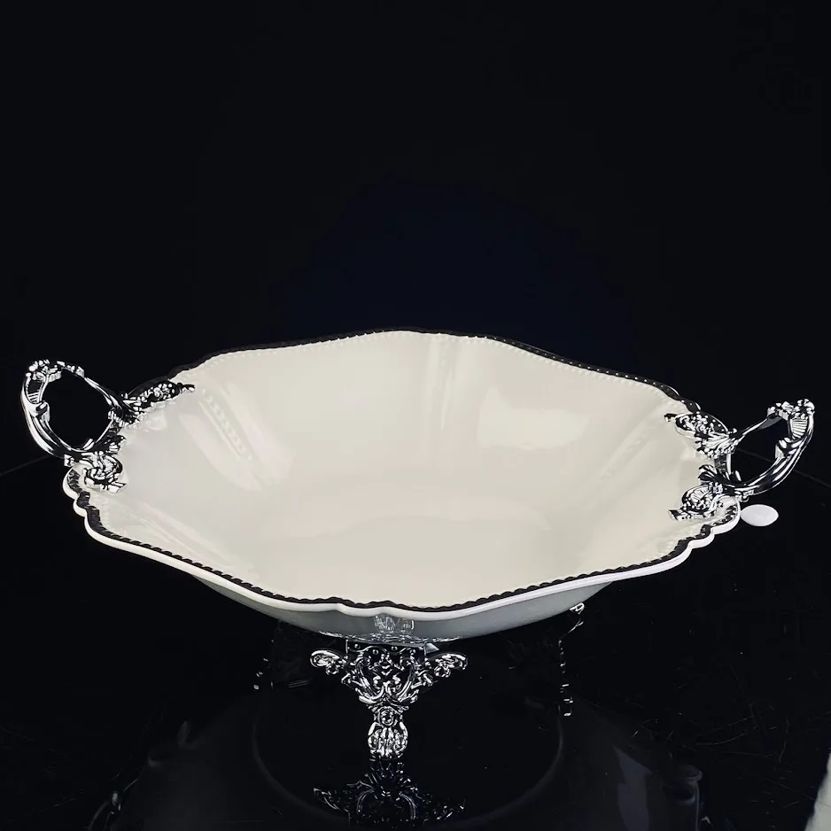 Коллекция посуды ATLANTIS изготовлена из фарфора, с рельефным краем и серебряной окантовкой. Изящные ручки и ножки изготовлены из облегчённого метала с качественным серебряным покрытием. Упаковано в подарочную коробку Материал: фарфор Не рекомендуется использовать в микроволновой печи и мыть в посудомоечной машине, по причине возможного повреждения декоративного покрытия.