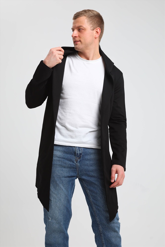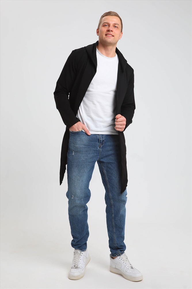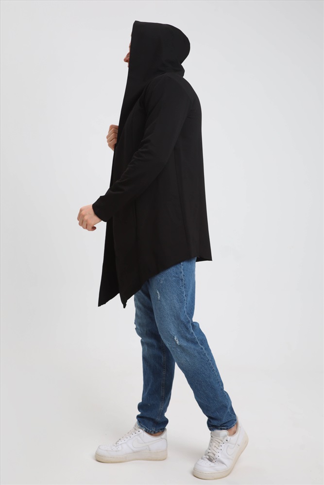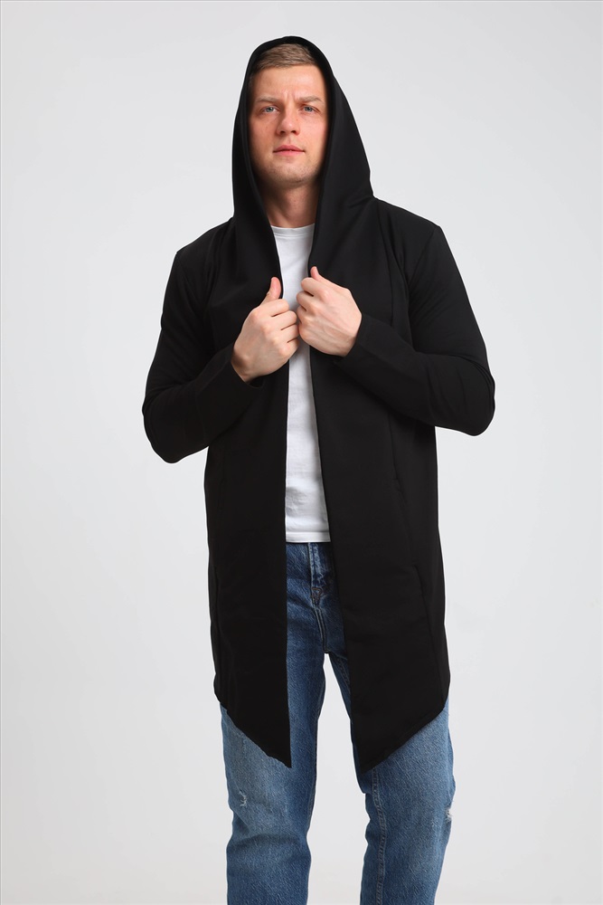 Модная современная мужская толстовка-мантия. Без застежки, с капюшоном, по бокам карманы. Асимметричный низ, передние полочки длиннее спинки