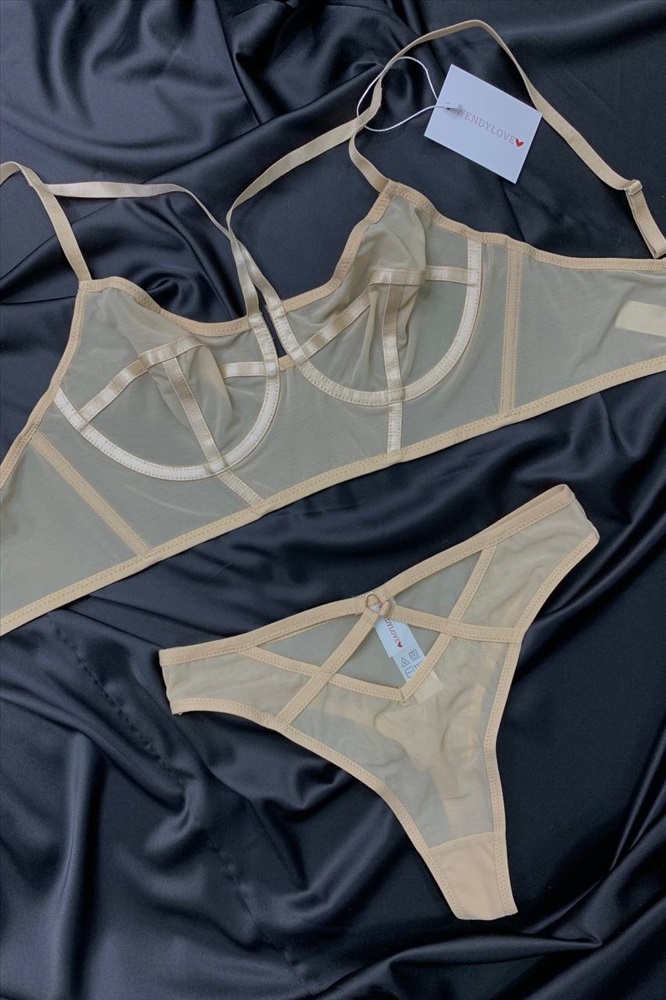 Декорированный стропами бюстгальтер-корсет мягко прилегает и поддерживает грудь, образуя V-образный вырез. Расширенный стан в сочетании с мягкими чашками на каркасах обеспечивают комфортную посадку и застегивается на два крючка.