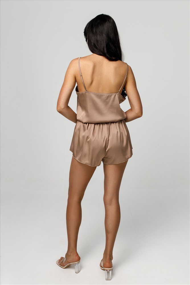Лёгкая и изысканная пижама из шелковой ткани подарит комфорт и ощущение нежности на коже. Топ на тонких регулируемых бретелях с V-образным вырезом подчёркивает хрупкость силуэта, а свободный крой обеспечивает удобство. Шорты с широкой резинкой на талии идеально садятся по фигуре. Декоративные пуговицы добавляют элегантности и делают образ ещё более утончённым.