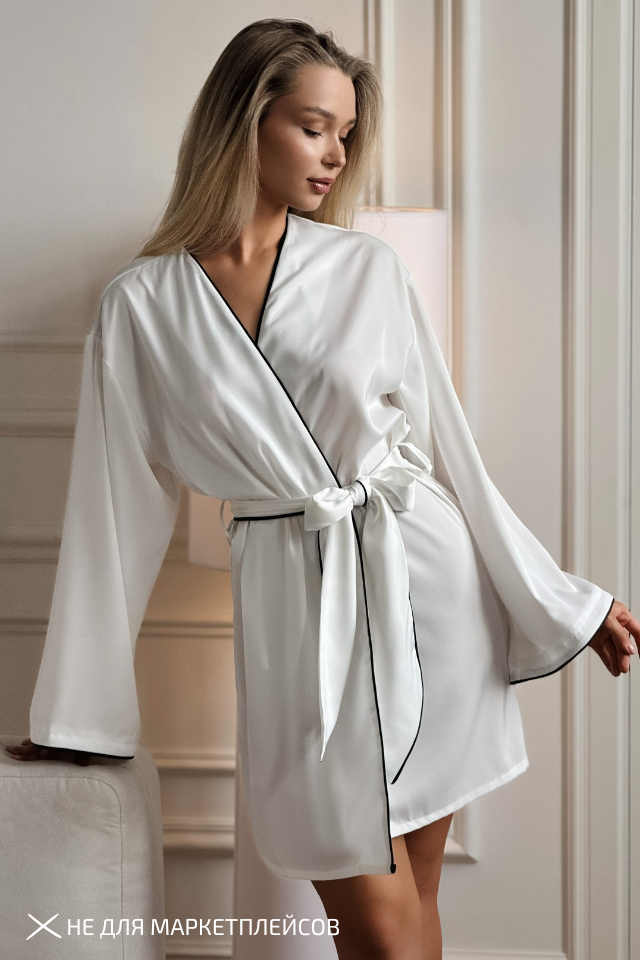 Широкие рукава, аккуратная контрастная окантовка и пояс в тон создают утончённый силуэт, подчёркивая изящность линии талии. Такой халат легко становится любимым элементом домашнего гардероба — стильным, уютным и женственным.