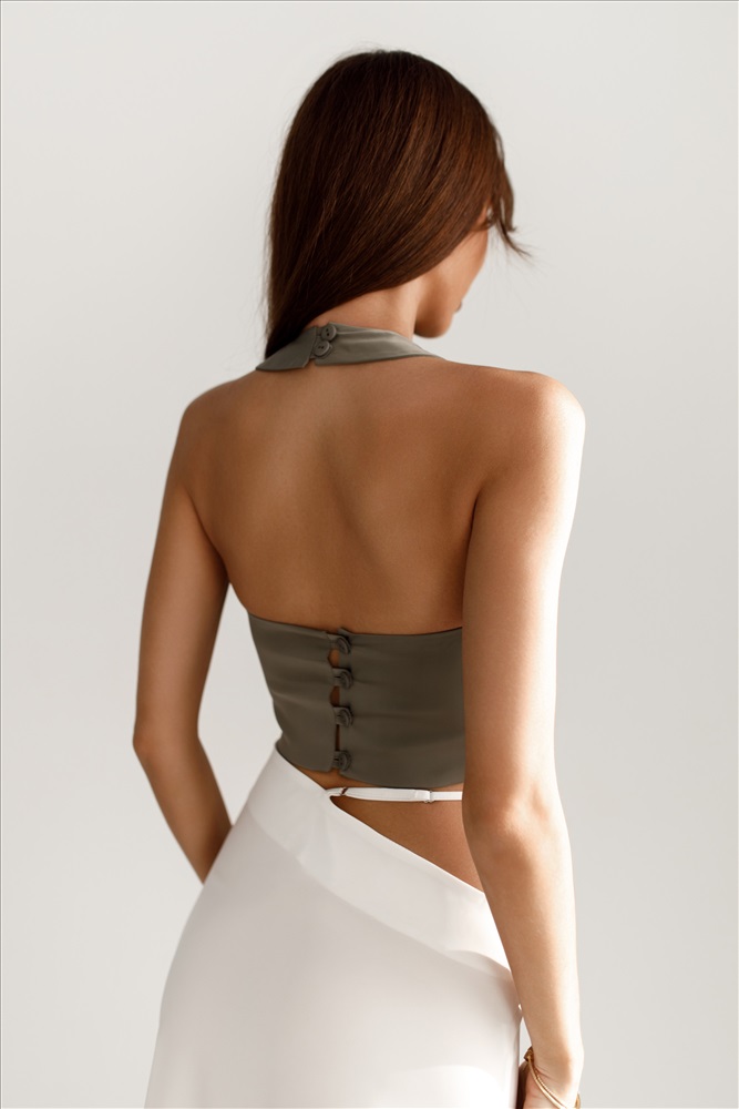 Укороченный топ с оригинальным кроем. Имеет асимметричный нижний край, который заостряется в центре, придавая образу современный вид. Топ выполнен из плотной атласной ткани, создающей минималистичный и элегантный эффект. Лиф имеет широкие бретели и высокий вырез, подчеркивающий плечи и ключицы.