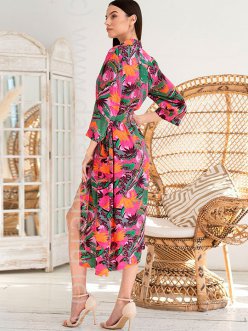 Удлинённая рубашка Mia-Amore выполнена из вискозы с ярким принтом. Удлиненная рубашка на пуговицах с короткими цельнокроенными рукавами, рубашечным воротником и разрезами по бокам, по талии регулируется съемным поясом. Низ рукавов рубашки оформлен узкой манжетой. В боковых швах есть карманы.