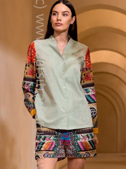 Материал: 60% хлопок, 40% лён Комплект Mia-Amore состоит из рубашки с воротником-стойкой и шорт, выполнен из хлопка со льном. Полочка рубашки выполнена из однотонной ткани, а спинка и рукава рубашки и шорты – из принтованной. Шорты с широким эластичным поясом. По бокам шорт расположены карманы. Комментарии к товару