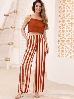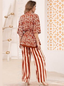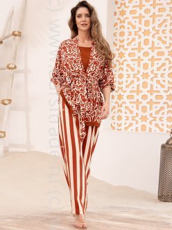 Комплект-тройка Mia-Amore состоит из жакета, топа на бретелях и широких брюк: жакет выполнен из основной принтованной вискозы, топ - из однотонной вискозы, а брюки – из принта-компаньона в полоску. Низ жакета декорирован однотонной планкой. По бокам брюк расположены карманы. Жакет по талии регулируется съемным поясом.