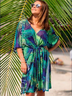 Материал: 100% полиэстер Короткая туника свободного силуэта со спущенными рукавами выполнена из тонкой гигроскопичной мягкой принтованной сетки. Сетка принтована ярким рисунком в виде пальмовых листьев разных оттенков - от салатового до глубокого изумрудного. Ширина туники по талии регулируется кулиской с завязками. Завязки декорированы павлиньим перышком на конце. Комментарии к товару
