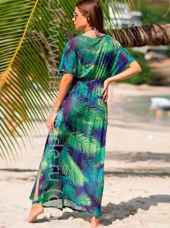 Материал: 100% полиэстер Распашная спереди длинная туника свободного силуэта со спущенными рукавами выполнена из тонкой гигроскопичной мягкой принтованной сетки. Сетка принтована ярким рисунком в виде пальмовых листьев разных оттенков - от салатового до глубокого изумрудного. Ширина туники по талии регулируется кулиской с завязками спереди. Завязки декорированы павлиньим перышком на конце. Комментарии к товару