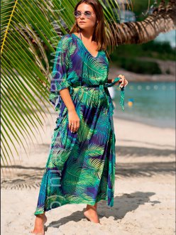 Длинная туника свободного силуэта со спущенными рукавами выполнена из тонкой гигроскопичной мягкой принтованной сетки. Сетка принтована ярким рисунком в виде пальмовых листьев разных оттенков - от салатового до глубокого изумрудного. Ширина туники может регулироваться по талии поясом.