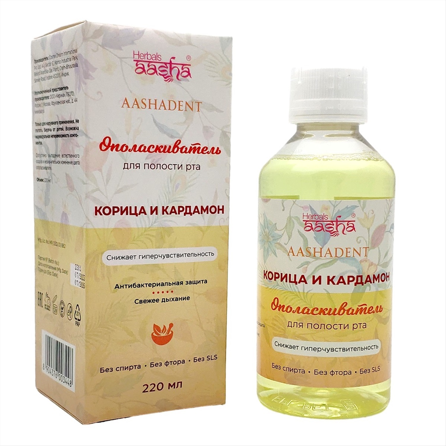 Натуральный ополаскиватель для полости рта Корица и Кардамон Ааша Хербалс специально разработанная формула на основе натуральных активных компонентов без использования спирта. Кора корицы и масло розмарина обладают антимикробным свойством, защищающим от бактерий и грибковых инфекций, вызывающих неприятный запах изо рта. Кардамон, известный как «королева специй» издревле используется для придания свежести дыханию, обладает противовоспалительным и антиоксидантным свойством, снижает чувствительность зубов. Мята придает освежающий вкус и приятную прохладу, обеспечивает свежее дыхание на весь день.
