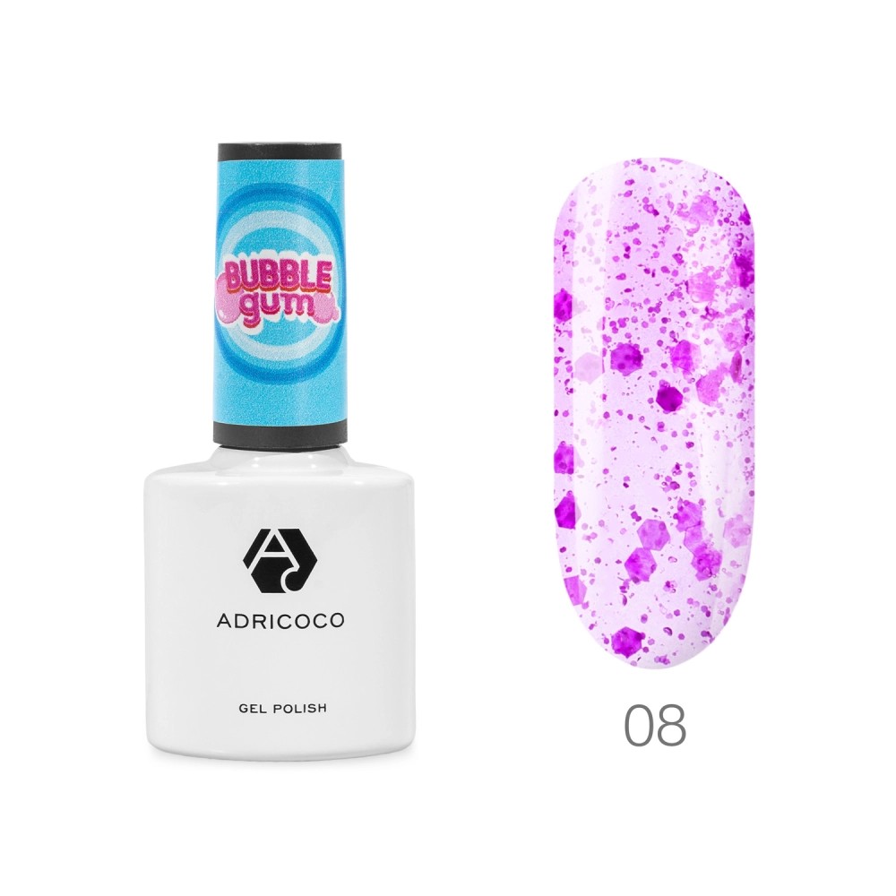 Коллекция гель-лаков ADRICOCO Bubble Gum состоит из 8 сочных цветов, которые смотрятся броско и стильно в качестве самостоятельного покрытия, а также могут стать нежным и красивым акцентом в нейл-арте. Каждый оттенок — это яркое сочетание цветного витражного фона и микса неоновой слюды. Гель-лак Bubble gum не требует нанесения базы, можно сразу наносить на ноготь; имеет среднюю консистенцию.