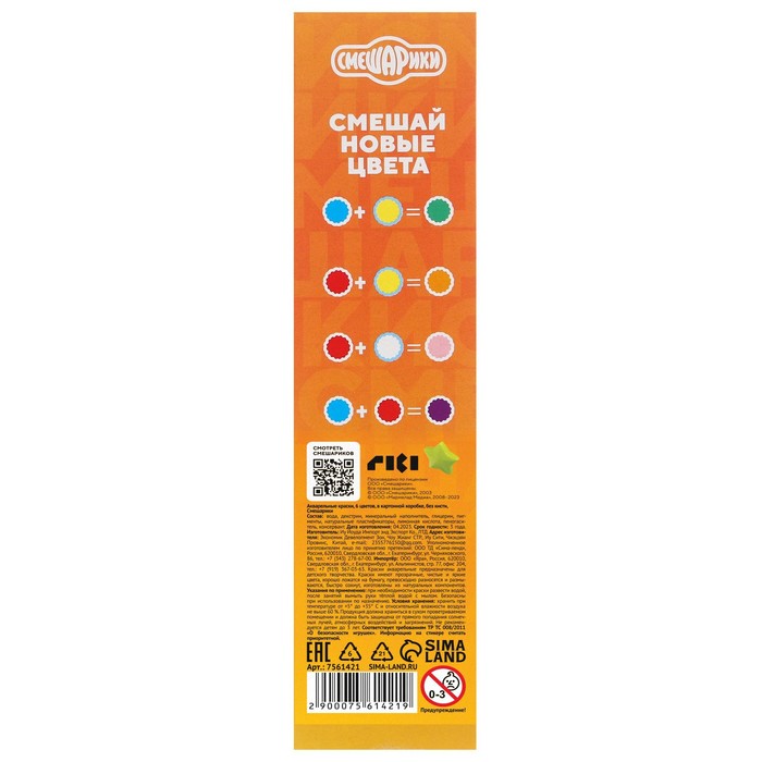 Производитель: Смешарики; Габариты: 18 x 4,5 x 1; Страна: Россия; В боксе: 60 шт; Фасовка: по 1 шт; Индивидуальная упаковка: Цветная картонная коробка; Сертификат: ЕАС; Количество цветов: 6; Особенности цвета: Без особенностей; Европодвес: Нет; Вид упаковки: Коробка картонная; Кисть: Нет; Твёрдость: Полутвердая (Сухая); Штрихкод на единице товара: Да; Температурное ограничение транспортировки: Нет; Фиксированная цена: Да