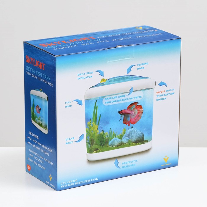 Аквариум полностью готов к работе. Светодиодная лампа встроена в крышку. Объем аквариума составляет 4,4 литра.