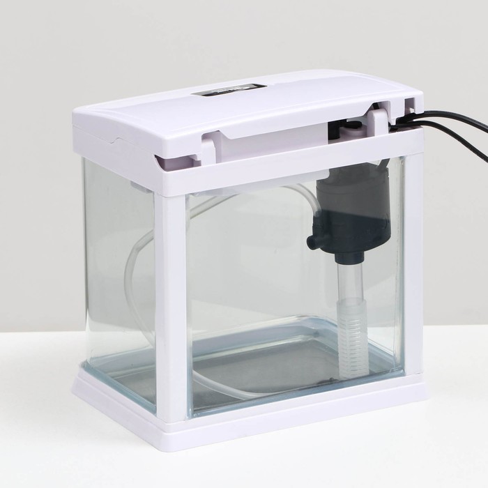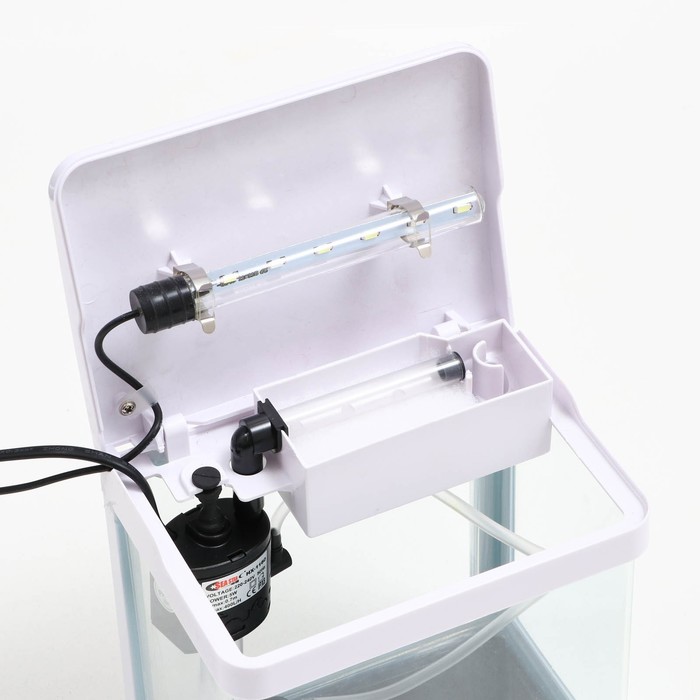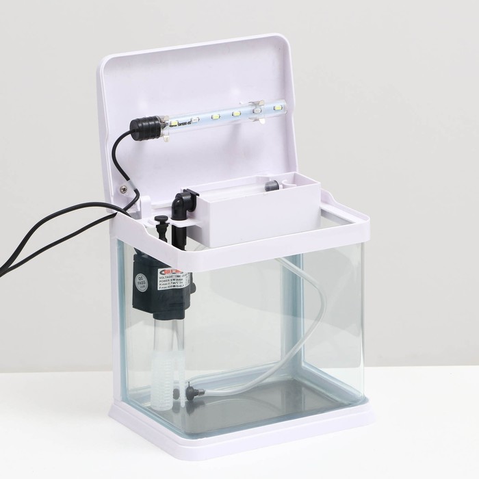Полезный объем аквариума составляет 3.5 литра. Аквариум полностью готов к работе. Фильтр и светодиодная лампа встроены в крышку аквариума.