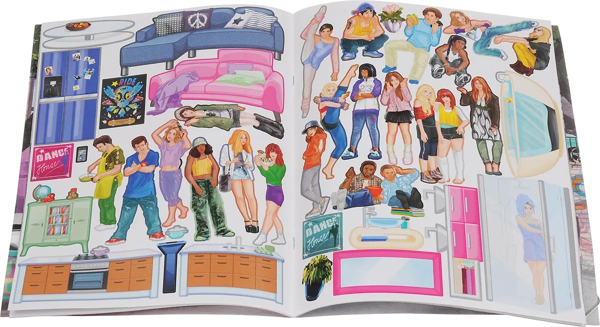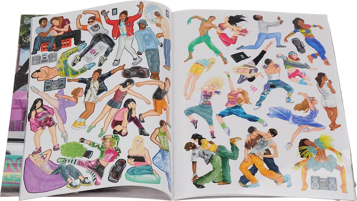 Создай свою собственную танцевальную студию. С помощью набора для творчества можно украсить студии в любой стиль танца. Альбом включает листы с наклейками людей и разных аксессуаров. Странички альбома нужно заполнить движением танца и веселой историей.