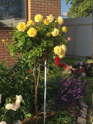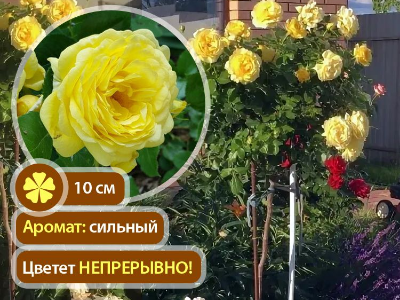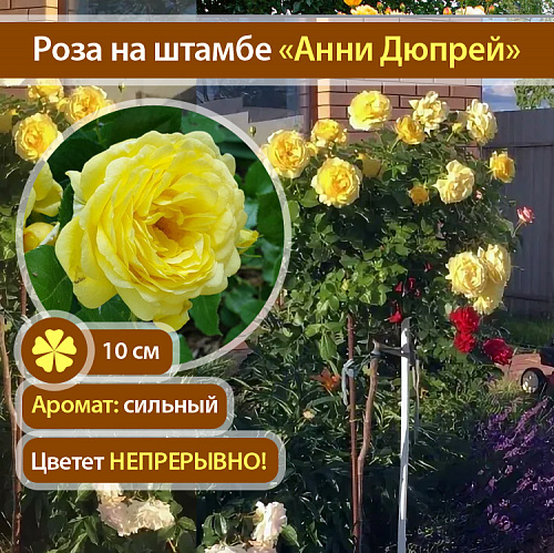 Роза, невероятно восхищающая не только своей красотой, но и историей создания, а также прототипом для названия - штамбовая роза сорта Anny Duperey "Анни Дюпрей". Штамбовые роза - это любая сортовая роза, привитая на штамб шиповника. Они отличаются своей красотой, элегатностью и другими чудесными характеристиками, которые мы рассмотрим на примере данного сорта. Этот необычный сорт назван в честь талантливой актрисы и писательницы Анны Дюпре. Роза стала олицетворением нежного и проникновенного образа этой женщины. Как и сама актриса, роза поражает своей загадочностью и манящей непредсказуемостью. Выведен в 2006 году группой селекционеров Meilland, и уже в 2008 году получил сертификацию по системе ADR. Растёт сорт на штамбе, привитом 3-4 прививками, высотой в 160-170 сантиметров, а крона его в диаметре достигает до 100 см, несёт на своих побегах светло-зеленые глянцевые листья, подчеркивающие яркость цветов. На каждом стебле растёт до трех роз, а цветение их непрерывное. Крупные махровые бутоны формируют россыпь тонких и бархатных лепестков, которые завиваются в затейливый узор. Окраска их от центра к краям переливается от яркого желтого цвета до совсем уж бледного, обеспечивая нежность и элегантность. Дополняет образ насыщенный лимонный аромат цветков, добавляя яркости в их восприятие. Сорт устойчив к различным заболеваниям, к дождю и жаре, предпочитает солнце или полутень. Роза, как и сама актриса Анни Дюпре, обладает особым очарованием, влюбляет в себя с первого взгляда и больше никогда не отпускает Заказать и купить саженцы роз на штамбе Anny Duperey "Анни Дюпрей" можно нажав кнопку "В корзину". Отправку осуществляем по всей территории России. Для отправки: корень саженцев упаковывается в удобренный кокосовый субстрат и пищевую пленку, что не позволяет влаге долгое время испаряться и поддерживает питание саженца длительное время. Тем самым гарантируя, что саженцы придут к вам в превосходном состоянии. ХарактеристикиКомментарии к товару