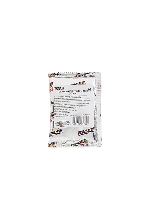 Производитель: ИП Агапкин ПА; Состав: глюкоза, аскорбат натрия, дигидрокверцетин; Норма внесения: 3 гр на 1 кг сырья; Подходит для: для использования в ветчинах и колбасах длительного созревания, стейках сухой выдержки для предотвращения прогоркания (старения) жира.; Количество в упаковке: 30 г; Условия и сроки хранения: 2 года при комнатной температуре