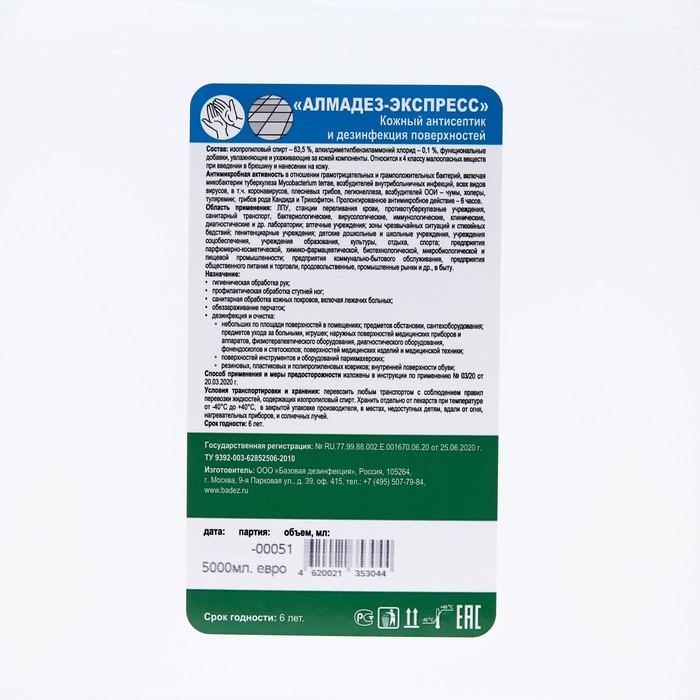 Производитель: Алмадез; Габариты: 15 x 19 x 23,5; Страна: Россия; В боксе: 4 шт; Состав: См. на упаковке; Материалы: см. на упаковке; Фасовка: по 1 шт; Индивидуальная упаковка: Без упаковки; Сертификат: СТР; Объём, мл: 5000; Вид: Антисептик; Назначение: Профессиональные, Бытовые; Темпер. ограничение НЕ НИЖЕ ℃: 0; На спиртовой основе: Да; Вид средства: Лосьон