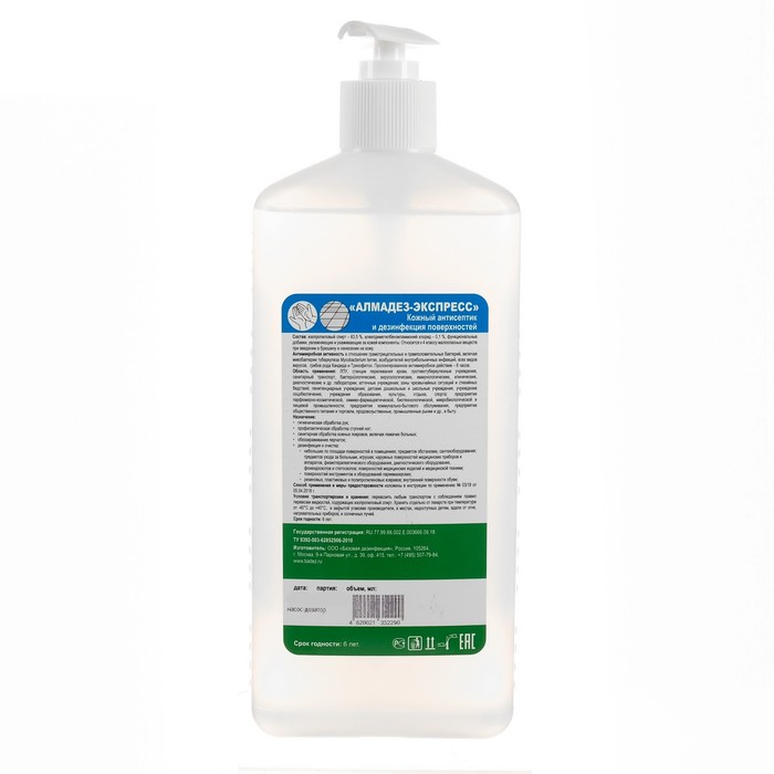 Производитель: Алмадез; Габариты: 8,5 x 7 x 23; Страна: Россия; В боксе: 10 шт; Состав: См. на упаковке; Материалы: см. на упаковке; Фасовка: по 1 шт; Индивидуальная упаковка: Без упаковки; Сертификат: СТР; Объём, мл: 1000; Назначение: Бытовые; Темпер. ограничение НЕ НИЖЕ ℃: 0; На спиртовой основе: Да; Вид средства: Лосьон