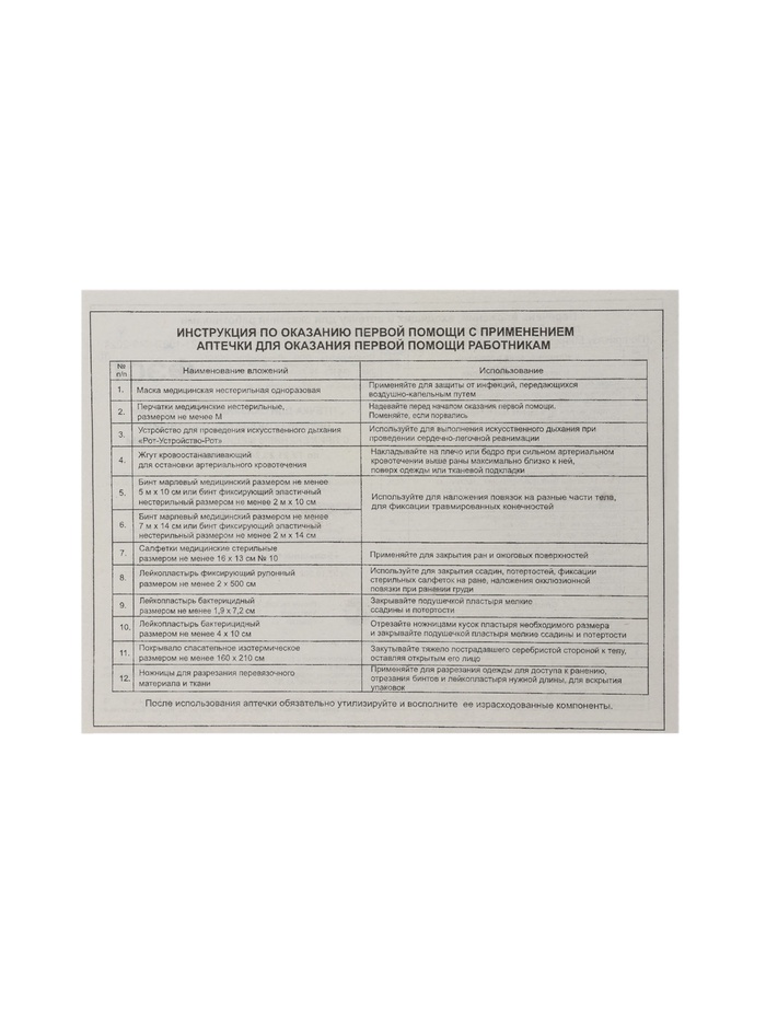 Производитель: Фэст; Габариты: 30 x 14 x 25; Страна: Россия; В боксе: 7 набор; Состав: См. на упаковке; Материалы: см. на упаковке; Фасовка: по 1 набор; Индивидуальная упаковка: Без упаковки; Сертификат: Не подлежит сертификации; Цвет: Бирюзовый; Материал корпуса: Текстиль; Вид застёжки: Молния; С наполнением: Да; Стандарт: ГОСТ РФ; Вид аптечки: Автомобильные; Назначение: Первая помощь; По ГОСТу/СаНПиНу: Нет; Тип: Коллективная Автомобильная аптечка первой помощи - это набор медицинских средств и инструментов, предназначенный для оказания первой помощи в случае ДТП или других экстренных ситуаций на дороге. Комплектация * Маска медицинская нестерильная одноразовая 10 шт * Перчатки медицинские нестерильные, размером не менее м 2 пары * Устройство для проведения искусственного дыхания «Рот-Устройство-Рот» 1 шт * Жгут кровоостанавливающий для остановки артериального кровотечения 1 шт * Бинт марлевый медицинский размером не менее 5 м × 10 см 4 шт * Бинт марлевый медицинский размером не менее 7 м × 14 см 4 шт * Салфетки марлевые медицинские стерильные размером не менее 16 × 14 см №10 2 уп * Лейкопластырь фиксирующий рулонный размером не менее 2 × 500 см 1 шт * Лейкопластырь бактерицидный размером не менее 1,9 х 7,2 см 10 шт * Лейкопластырь бактерицидный размером не менее 4 х 10 см 2 шт * Покрывало спасательное изотермическое размером не менее 160 × 210 см 2 шт * Ножницы для разрезания повязок 1 шт * Инструкция по оказанию первой помощи с применением аптечки для оказания первой помощи работникам 1 шт * Футляр или сумка 1 шт
