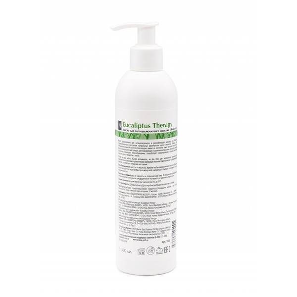 Идеально сбалансированная композиция натуральных растительных масел эвкалипта, абрикоса, сои, оливы и виноградной косточки благотворно влияет на состояние кожи, оказывает питательное, восстанавливающее, смягчающее, регенерирующее и заживляющее действие. Процедура массажа с маслом стимулирует кровообращение, способствует стимулированию процесса липолиза, улучшает дренаж жидкости в тканях.